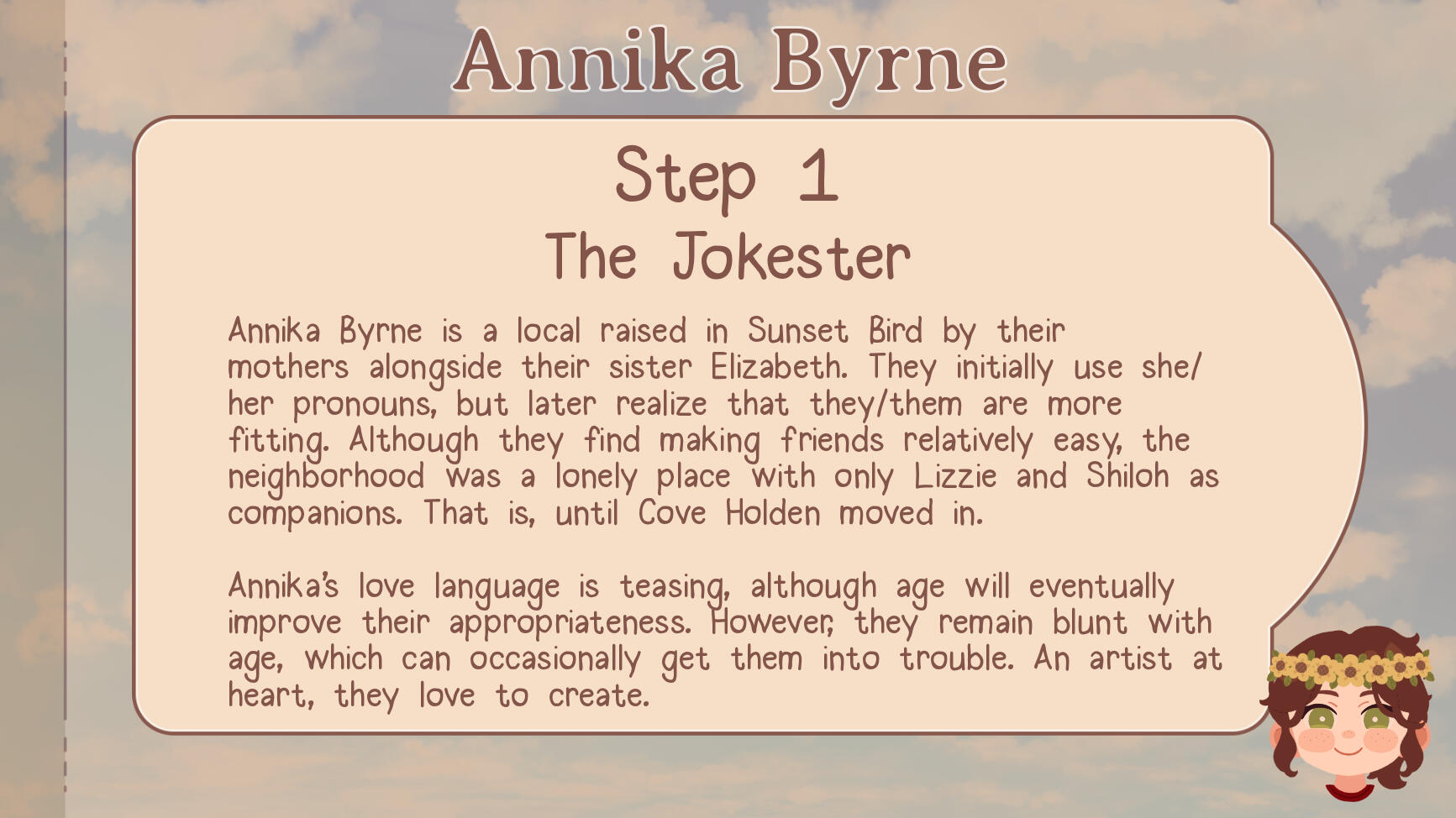 Annika realizes they are agender at 11. Using she/her pronouns and feminine descriptors prior to that age is okay, but intentionally misgendering them after age 11 won't be tolerated.Annika is more than open to crossovers. Perhaps your muse moves into Sunset Bird? Perhaps Annika moves into your muse's town/city as an adult. The options are endless!
